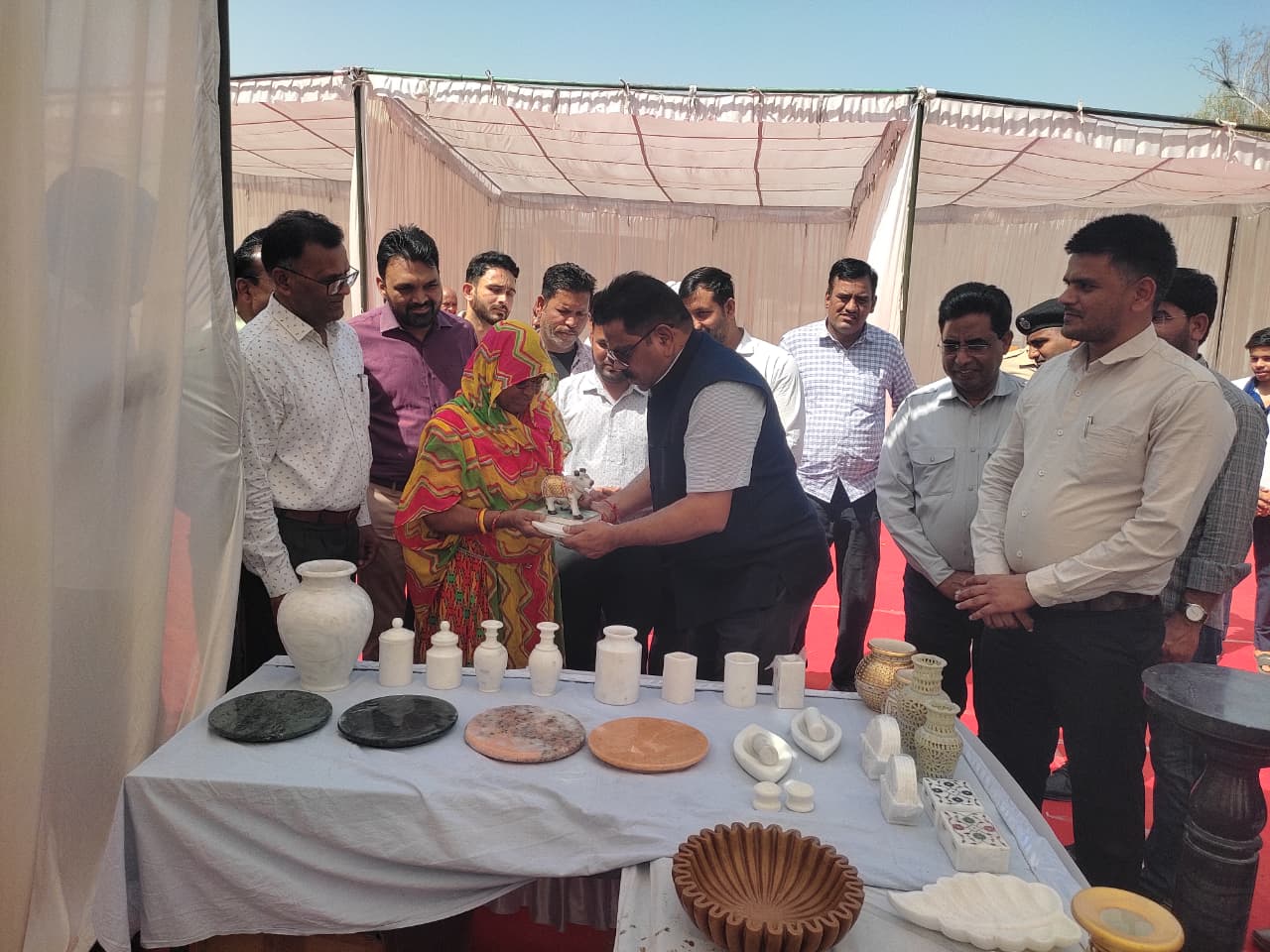 इस दौरान जिला कलक्टर डॉ खड़गावत और श्रीमती मानी देवी ने विभिन्न स्टॉल्स का अवलोकन किया। जिला कलक्टर ने जिला उद्योग केंद्र के अधिकारियों एवं स्टॉल प्रतिनिधियों से संवाद कर मकराना मार्बल और ग्रेनाइट के हस्तशिल्प उत्पादों की जानकारी ली और कारीगरों के हुनर की सराहना की।